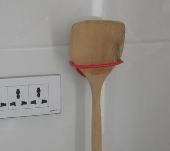 这是从我们平时天天见到的油桶上弄下来的塑料提手,我们用胶把他粘在厨房的墙上,这样我们就可以放铲子,免得放在桌台上太脏了。平时你有没有注意到呢!